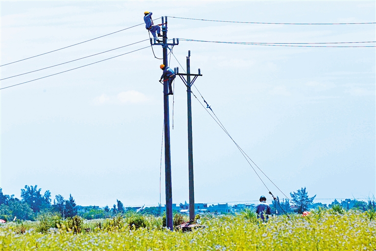 台风季节临近,海南电网公司加速推进防风加固工作,改造项目预计今年7月完工。图为儋州市白马井镇南岸村,儋州供电局工作人员正在加固电网设施。本报记者 陈元才 特约记者 谢振安 摄