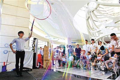 图为孩子们在观赏魔幻泡泡秀。本报记者 武威 摄