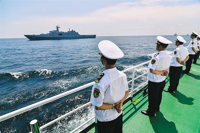 5月27日,在马六甲海峡凌家卫海域,中国海事“海巡31”船接受检阅。 当日,为期五天的东盟地区论坛第四次救灾演练继续进行。中国海事“海巡31”船与中国海军井冈山舰、海警3306船、海警31101船、东海救101船以及马来西亚、泰国、印度等国家和地区的28艘舰艇、4架直升机参与了此次海上搜救行动演习。 新华社发(张纹综 摄)