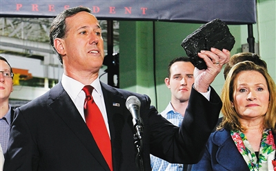 5月27日,在美国宾夕法尼亚州卡伯特,前宾夕法尼亚州联邦参议员、共和党人里克·桑托勒姆手拿着一块煤,宣布参加2016年美国总统选举。 他在宣布参选大会上承诺为美国家庭创造更多工作机会,并誓言打击极端组织“伊斯兰国”。 新华社/路透