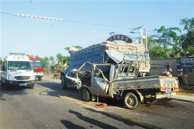 据三亚市消防支队方面介绍,事故地点位于225国道上,临近三亚市崖州区梅山村长山路,车祸系一辆载有10人的小货车,与一辆满载水泥的大货车发生追尾。从现场情况看,小货车右侧车头与大货车左侧车尾相撞。