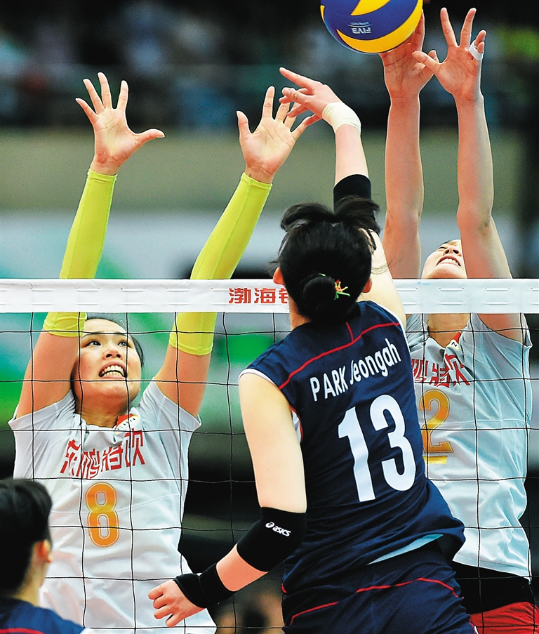 5月28日,在天津体育馆进行的2015年亚洲女子排球锦标赛决赛中,中国队以3比0战胜韩国队,夺得冠军。图为中国队球员曾春蕾(左)和惠若琪(右)在比赛中拦网。 新华社发