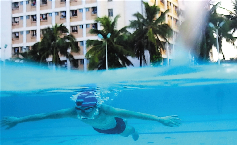 连日来,海南持续高温,天气炎热,游泳成了许多人喜爱的消暑纳凉方式。图为5月28日下午,在海南师范大学的游泳池里,一名学生在游泳嬉水。本报记者 陈元才 摄