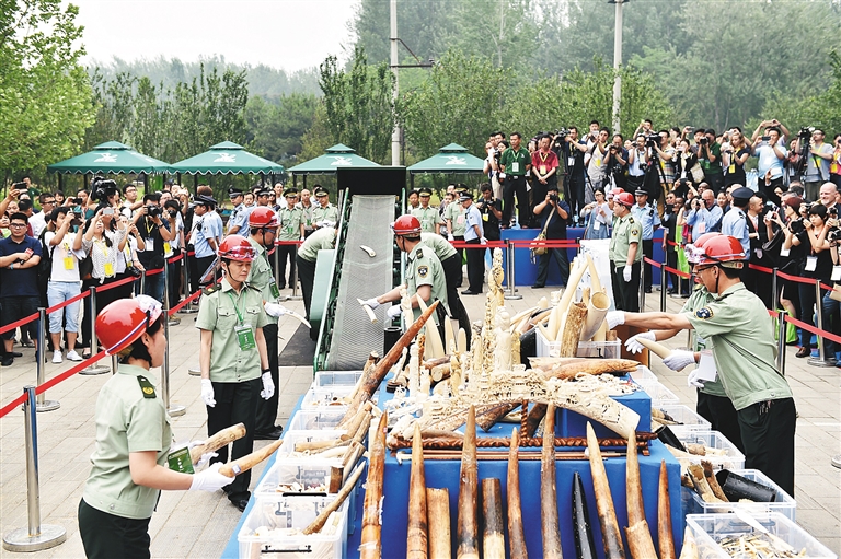 5月29日,工作人员在销毁非法象牙及象牙制品。 当日,国家林业局和海关总署在北京市野生动物救护中心联合举行“中国执法查没象牙销毁活动”,共销毁2014年以来执法机关查没并结案的非法象牙及象牙制品662.43千克,进一步彰显我国政府打击象牙走私等野生动物非法贸易的坚定立场。