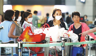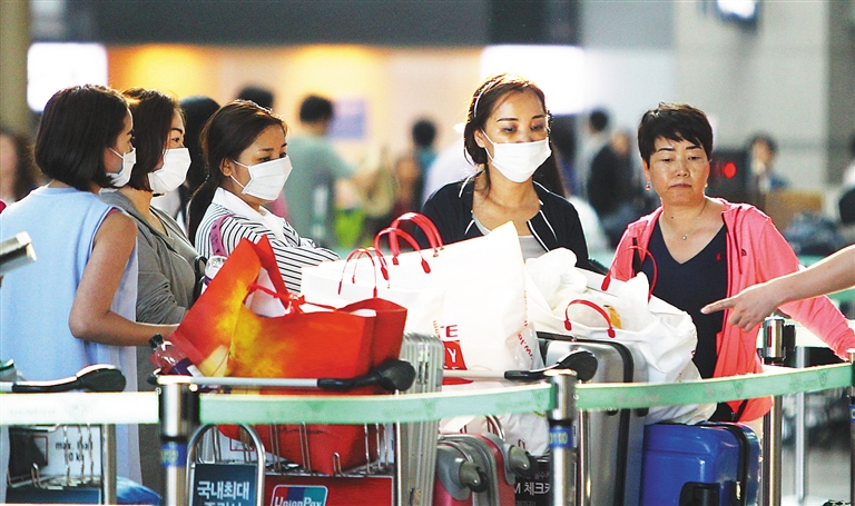 5月30日,在韩国仁川国际机场,佩戴口罩的乘客排队等候办理登机手续。 韩国保健福祉部30日例行通报说,当日新确诊了1例中东呼吸综合征患者。至此,韩国国内确诊的患者已增至12人,另有一名韩国患者在中国被确诊。新华社发