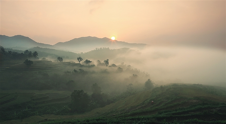 大自然赋予海南的资源丰富,古时,黎族人民主要靠采集、游狩猎为生,在坡地上种植山兰稻,形成“一年一砍山,几年一搬家”的狩猎+刀耕火种生活模式。在坡地上建梯田种植水稻在黎族地区极为少见。