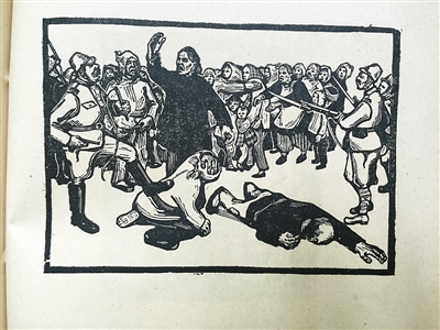 木刻亦称版画,是用刀具在木板上雕刻、复印出图画的艺术。我国新兴木刻运动是1929年由鲁迅倡导逐步发展壮大起来的,木刻艺术的视觉效果最具亲民性和感染力,通俗易懂为群众喜闻乐见。抗战时期,木刻这种艺术形式,被一批进步青年用作抗日救亡的工具,唤起民众,拿起武器,抵御外辱。它所产生的社会影响和效果,被誉为“时代的战鼓”和“革命的号角”。