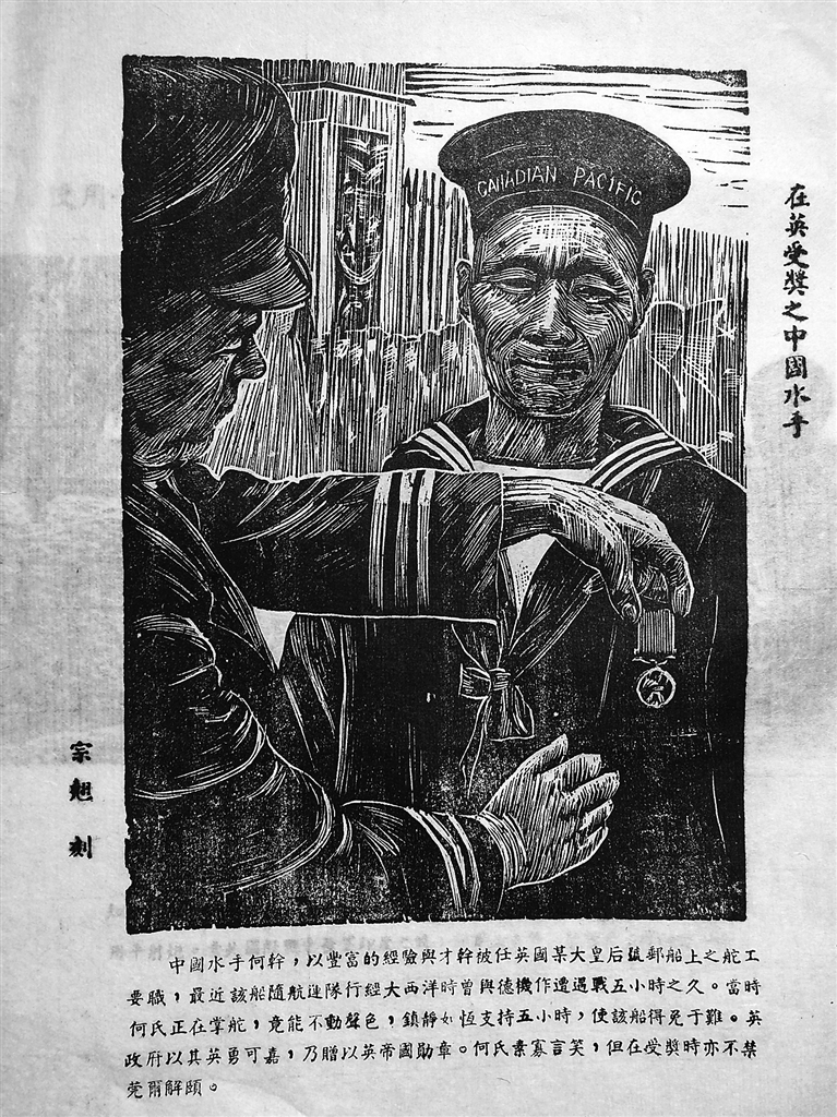 这期木刻期刊,收录10位作者的16幅作品,其中不仅有反映中国抗日战争题材的作品,如梅健鹰创作的《毋忘失地》以纪念九一八事变。亦有反映世界反法西斯内容的作品,如俊昶的《美新式潜艇下水》、尤玉英的《守卫埃及之英哨兵》、谭勇的《使用平射炮之印军》、陈艮的《英空军击落之德机遗骸》等。尤其值得一提的,是它的每幅木刻都配有详细的文字说明,进一步诠释了画面反映的内容,使图案鲜活起来,立体和连续了起来,强化了宣传效果。宗翘创作的《在英受奖之中国水手》,刻画一名水手正在接受领导给他佩戴胸章。所配的文字写道:“中国水手何干,以丰富的经验与才干被任英国某大皇后号邮船上之舵工要职,最近该船随航运队行经大西洋时曾与德机作遭遇战五小时之久。当时何氏正在掌舵,竟能不动声色,镇静如恒支持五小时,使该船得免于难。英政府以其英勇可嘉,乃赠以英帝国勋章。何氏素寡言笑,但在受奖时不禁莞尔解颐。”