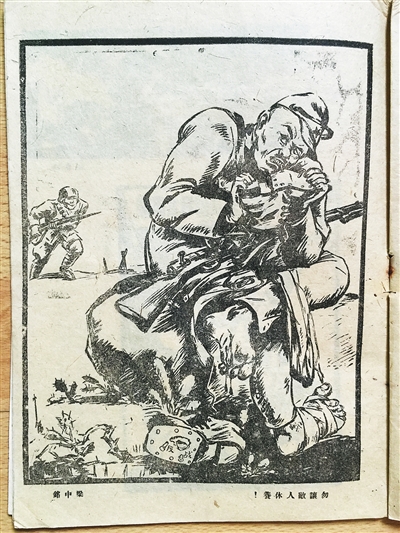 还有表现与日寇战斗的作品,荒烟的《搜索》,刻画一座因战火毁坏的城镇,远处还在燃着大火,浓烟滚滚。一具具日寇的尸体倒卧在废墟上。我军在断垣残壁之间搜索前进,一位站在高处的指挥员,手指着左前方,似在传达命令:“那里有敌情”。罗工柳创作的《马本斋将军的母亲》,描写抗日英雄马本斋率领八路军回民支队纵横驰骋在抗日战场上,敌人闻风丧胆。图案刻画鬼子为了诱降马本斋,到村里抓捕其母亲。并枪杀了不愿指认马本斋母亲的村民。为避免村民再遭鬼子杀害,英雄的母亲挺身而出,高喊:“住手,我就是马本斋的母亲!”