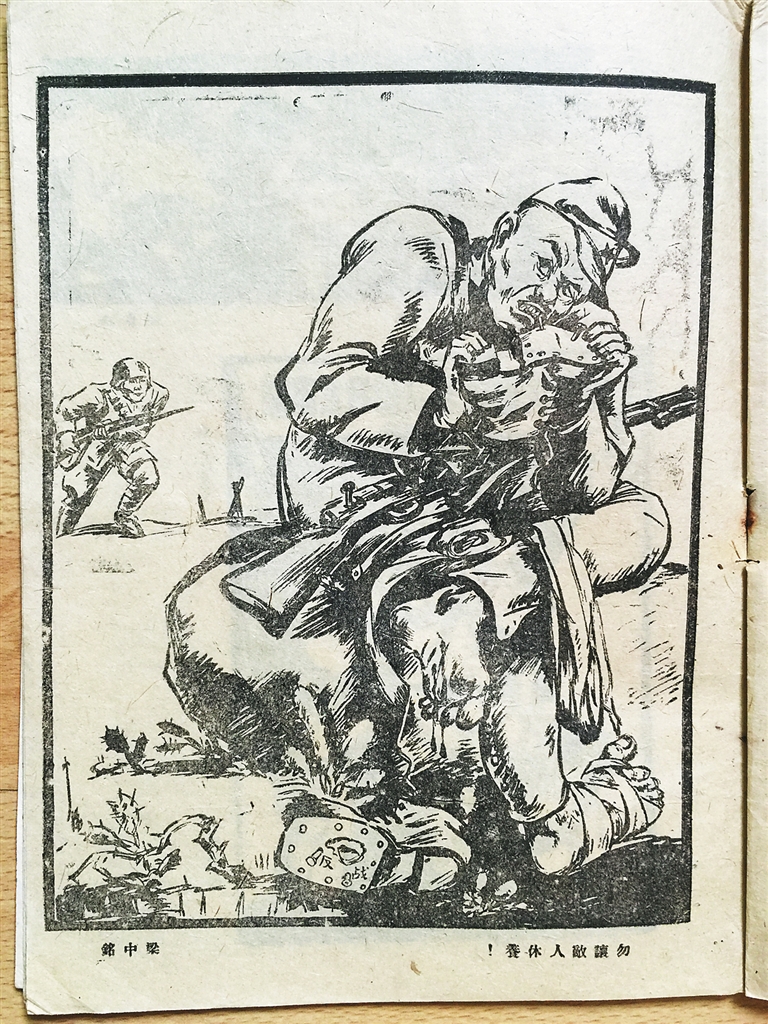 《现实版画》(第三期)系月刊,由“现实版画社”编辑,于1941年2月出版发行。本期收有9位作者的14幅木刻。为纪念“一·二八”十九路军淞泸抗日阵亡将士,梅健鹰创作的《英雄墓畔》,图案上的纪念碑高耸的塔身,雄伟端庄。石墩上站立着的士兵栩栩如生,象征着“一·二八”事变中浴血奋战的壮士。夏纬图创作的《起来、起来》,一名战士在昂头吹号,号声响起,前方一簇簇气团在涌动,表现被唤醒的民众,抖擞着精神奔赴抗日救亡的前线。《搜索前进》,表现一名骑兵在丛林中高度警觉敌情,搜索前进。这幅木刻雕刻细腻,形象逼真,是不可多得的优秀之作。