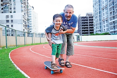 在海南中学校园,来自爱尔兰的Patrick陪5岁大的孩子吴奇瑞玩滑板,滑板是Patrick童年最喜爱的玩具,在六一节来临之际,他与自己的孩子一起重温童年的快乐时光。