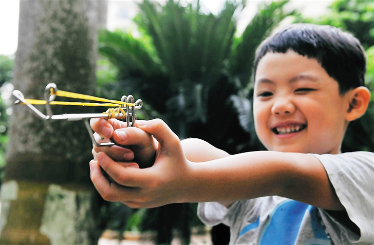 在儋州市英均村的陈传,喜欢玩弹弓,也喜欢自己制作弹弓,虽然现在保护鸟类不提倡打鸟,但是有时候跟小伙伴们比一比谁的弹弓射得远也成为他们童年的乐趣。