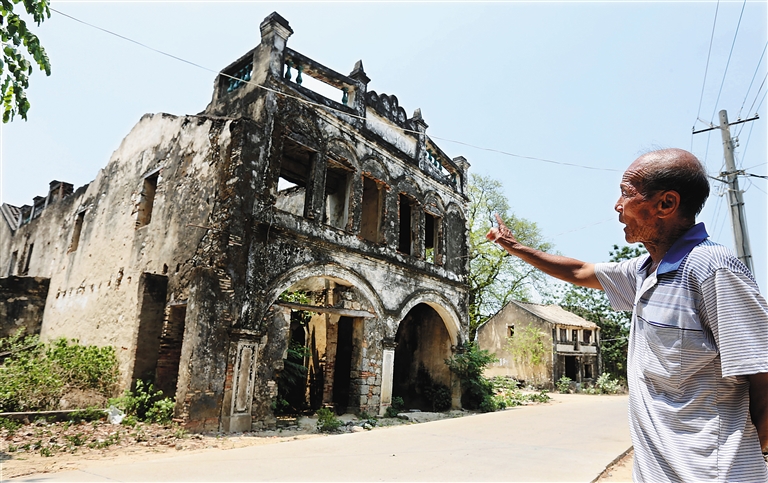 这样的骑楼在北黎村有数十座之多,然而大多数已经荒废,由于年久失修,一些楼房岌岌可危,一些则早已化残砖断瓦。“这些骑楼多建于20世纪二十、三十年代,当初都是临街商铺,一楼做生意,二楼住人。”北黎村委会文书王章沛告诉记者。