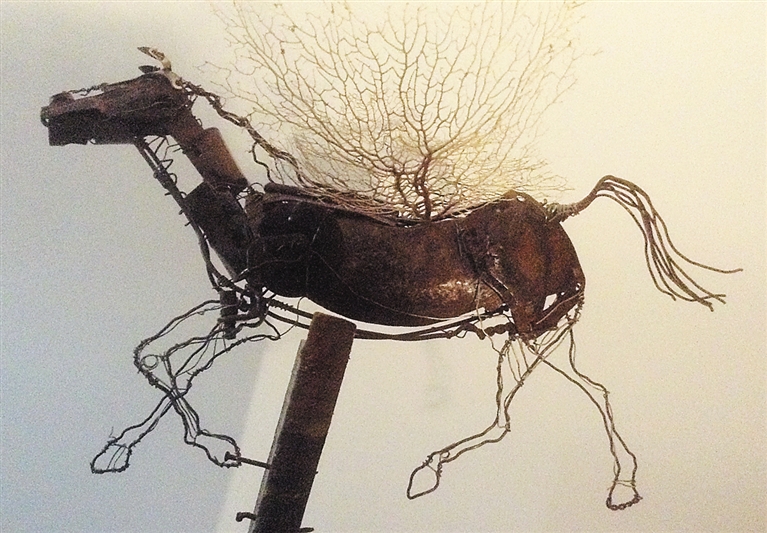 与大型机器零件焊接的金属DIY不同,何明的DIY艺术品都是纯手工“编织”而成。“如同缝纫那样,用铁丝在铁锈间穿来穿去。待结构先出来,外形细节再慢慢推敲。”在何明的概念里,即使是用一根不截断的铁丝也可以做出一只鸟、一匹马来。
