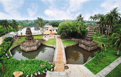 一弯清水中,两座石塔矗立村口,微风拂过,塔影倒影鳞波连连。美郎村的美榔姐妹双塔,历经七百余载风霜不倒,其神秘传说和精美的工艺造型吸引了无数游客驱车前来参观。