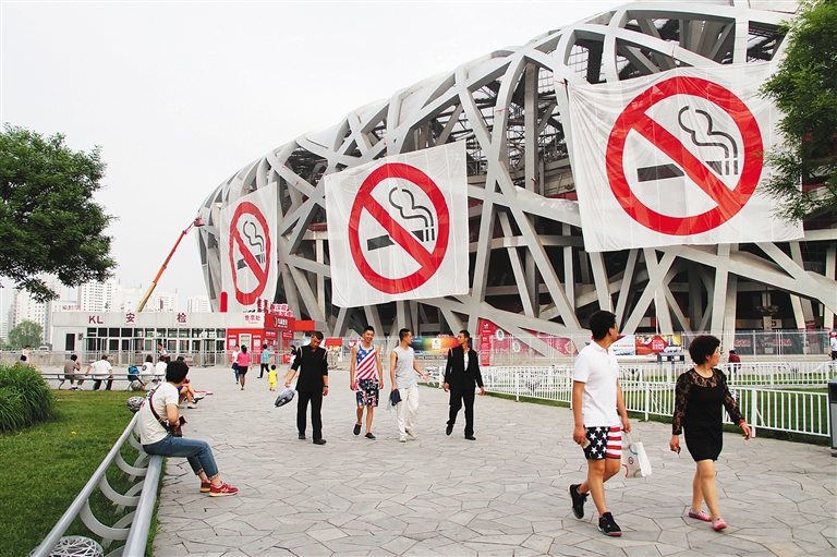6月1日,国家体育场“鸟巢”悬挂起巨幅禁烟标志。 当日,被称为“史上最严禁烟令”的《北京市控制吸烟条例》正式施行。该条例规定,公共场所、工作场所的室内区域以及公共交通工具内禁止吸烟,包括幼儿园、中小学校、文物保护单位、体育场、儿童医院在内的室外区域也禁止吸烟。违者将被处以个人最高200元人民币、单位最高1万元的罚款。 新华社发