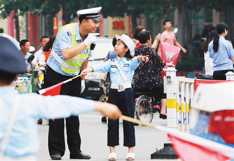 河南武陟:6月1日,一名“小交警”在交警的带领下体验道路指挥。