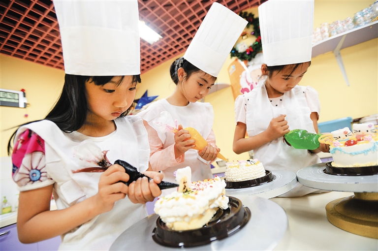 6月1日,三名儿童在沈阳儿童活动中心体验面点师工作。 本栏照片新华社发