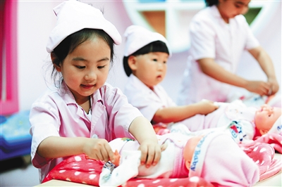 6月1日,三名儿童在沈阳儿童活动中心体验护士工作。