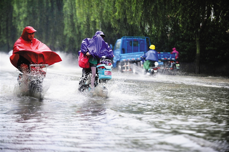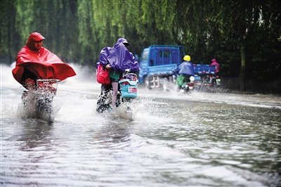 6月2日,在江苏扬州街头,人们冒雨骑车出行。当日,中央气象台18时继续发布暴雨黄色预警:预计2日20时至3日20时,江苏东南部、上海、江西中北部、浙江、安徽南部、湖北东南部、湖南中北部、贵州东部等地的部分地区有大雨或暴雨。 新华社发(孟德龙 摄)