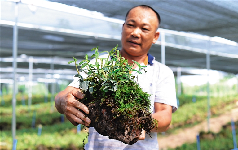 6月2日,海口市秀英区石山镇福安村委会美城村村民老王端起一块石头察看石斛兰的生长情况。石山镇遍地是火山石,温度湿度非常适合石斛兰生长,福安村去年试种了40多亩,获得成功。每亩产量为75公斤,每公斤售价1000元左右,石斛兰为全村带来巨大的经济效益。