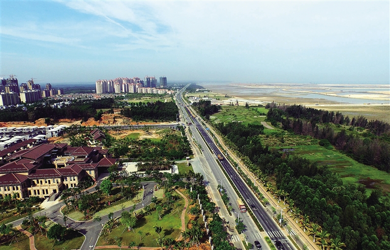 儋州市滨海新区滨海大道的两边高楼林立,景色优美。近年来,凭借着优越的区位优势和巨大的发展前景,儋州滨海新区吸引了众多大企业、大集团落户,新区面貌日新月异。本报记者 陈元才 特约记者 谢振安 摄