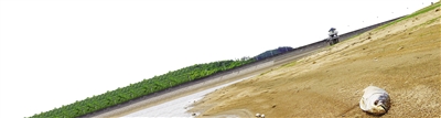 记者在位于保亭三道镇的赤田水库上游看到,库区入库部分支流已经干涸,露出了布满碎石的河床,河中的泥土上也长满了杂草。而偌大的水库,因为水位下降,周边的土坝、山体露出数米高的黄色泥土,犹如“腰带”般。