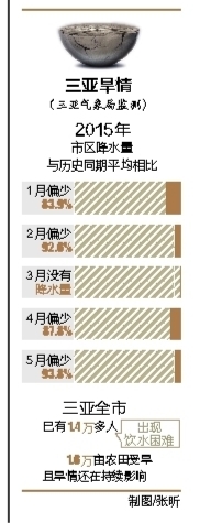 据三亚气象局监测,2015年市区降水量与历史同期平均相比,1月偏少83.9%,2月偏少92.6%,3月没有降水量,4月偏少87.8%,5月截至28日偏少93.8%;今年1-5月雨量相对常年偏少92.7%,明显偏少。目前,三亚全市已有1.4万多人出现饮水困难,1.6万亩农田受旱,且旱情还在持续影响。
