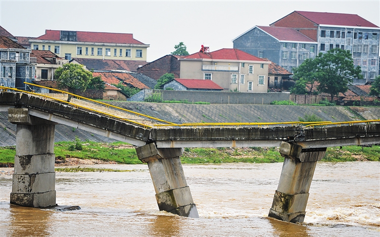 6月4日拍摄的出现桥面断裂、桥墩移位的筻口大桥。 当日凌晨,受暴雨洪水影响,湖南岳阳县筻口镇筻口大桥出现险情,桥墩发生移位,桥身被冲歪,部分桥面断裂,但整体未垮塌。截至6月4日12时,大桥已封闭,没有收到人员伤亡消息。据介绍,这座大桥位于湖南306省道上,是岳阳县通往平江县的主要通道之一。 新华社发