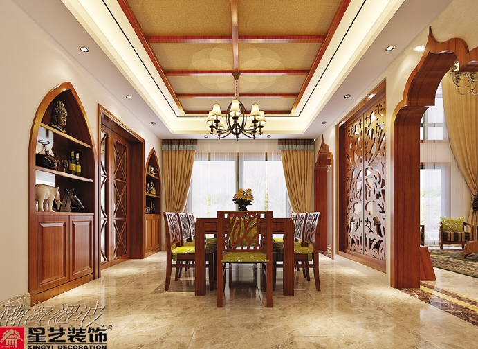 设计说明:平面和空间布局自由,空间互相穿插,室内外彼此视觉明亮,大量使用通透材质,流动的光影在心底交汇,泰式风格休闲清爽与自然并存,开阔高挑的空间灵动生辉。