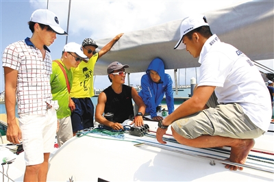 6月3日,三亚半山半岛帆船港,学员在帆船上进行升帆、降帆训练。