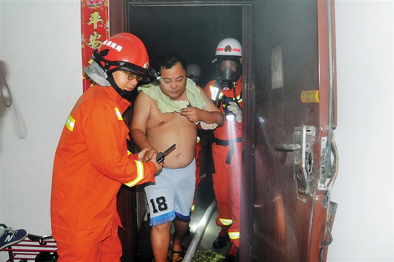 接到报警后,三亚市公安消防支队立即调派警勤、特勤中队6辆车,30名指战员赶赴现场救援。经过18分钟的破拆,消防官兵进入着火房间内部,利用水枪做掩护成功救出被困男子,随后将房间内的窗户打开排散浓烟。图为三亚消防官兵成功解救被困男子。本报记者 武威 通讯员 王通彬 摄