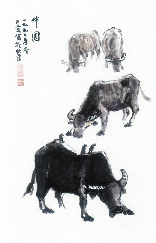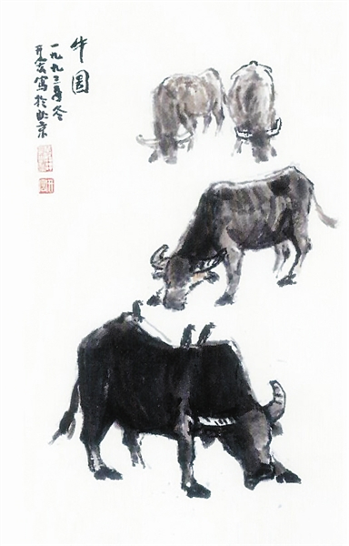 这次展览值得一看的还有一些颇富风情的架上雕塑和绘画。雕塑的尺寸虽都不大,然作为崔先生的主业——他曾在中央美术学院学了6年雕塑,展出的都是他一生创作的精品,它们造型严谨而活泼,手法既现实又写意,充分反映了作者质朴而生动、清新而典雅的艺术风格。特别是几件为构思创作而捏塑的小稿,这些平时难得一见的作品,能很清楚地让观众了解作者毕生坚持艺术面向生活的审美追求。至于绘画作品,尽管是作者的副业,但也非常具有其艺术个性,它们形态自然,构思精巧,意境新颖,趣味天成。笔者尤其喜欢以水牛为题材的几幅水墨画,这些水牛造型精确、生动,体态结实、厚重,在笔墨表现上更见个性:线条亦肯定有力,犹具大刀阔斧所刮削出的“石刻感”,墨色层次丰富,变化细腻,很有些信手雕塑的“泥巴味”,明显有别于传统中国画的表现手法。