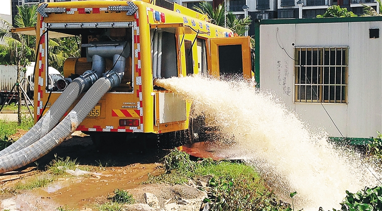 高考前一天,海口突降暴雨,海口旅游职业学校考点附近积水严重,排水部门抽水强排。