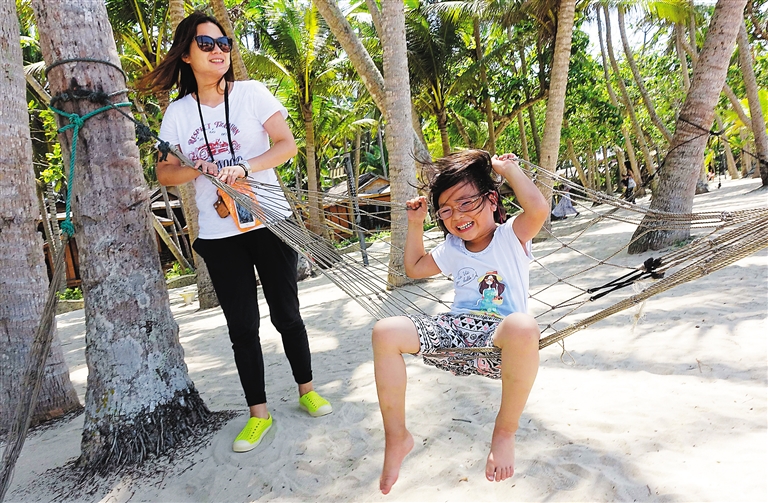 近日,文昌市东郊镇椰林海滩,一位小游客正在吊床上玩耍。舒适的海景木屋房、醉人的椰风海韵,让游人们在这里彻底放松。本报记者 王凯 摄