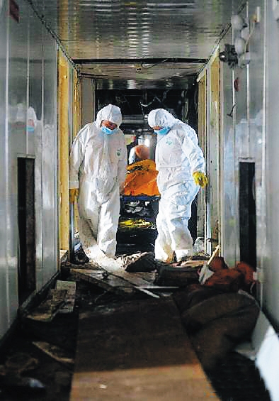 每当发现新的遇难者遗体,都先由防疫人员对遗体喷洒消毒药水。然后消防战士用电锯和液压钳移除遗体搬运的障碍,再将遗体装入双层黄色转运袋,按照6人一组抬担架的方式搬运遗体。这一过程每个细节、每个动作大家都小心翼翼,力求不因转运造成任何遗体再受损伤。