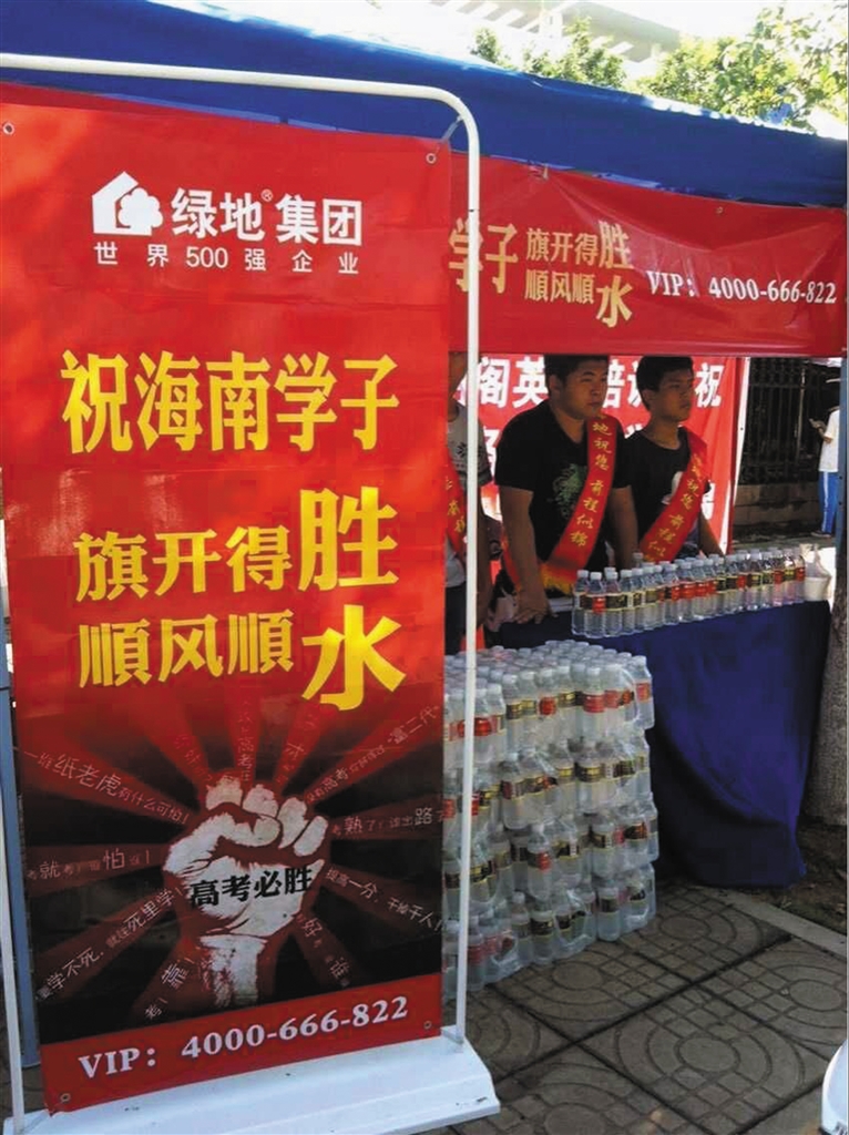 绿地集团为了给考生以及广大家长送去一份及时的清凉与关爱,高考期间,绿地集团在海口、三亚全市范围内考点踊跃献爱心,设立“清凉加油站”,并送出50000瓶免费胜水,助力海南学子2015年高考。青春无悔,梦想在六月绽放,绿地海南祝愿广大学子高考旗开得胜,顺风顺水!