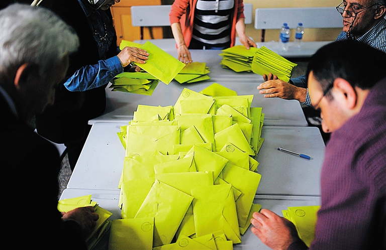 6月7日,在土耳其伊斯坦布尔,工作人员在清点选票。 初步统计结果显示,土耳其执政的正义与发展党(正发党)在7日的议会选举中获得41.45%的选票,领先于其他各党派,但由于议席暂不过半数,不能一党单独执政。
