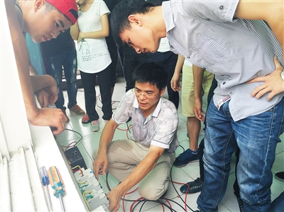 “同学们自己动手接一下太阳能电站的线路……”海南职业技术学院六层高的图书馆楼顶,温度计显示室外已经达到30摄氏度,汗水已经湿透了周亚东的T恤衫和白色休闲裤,这是2013级电子应用专业学生的太阳能电站的理论实操一体课。