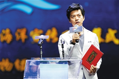 6月8日,2015年世界海洋日暨全国海洋宣传日开幕式在三亚千古情大剧院举行。著名歌手李健从国家海洋局局长王宏手中接过聘书,成为海洋公益形象大使。本报记者 武威 摄