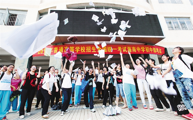 6月9日,在海南中学初中部考点,海中高三(20)班的考生们高空抛起复习试卷,庆祝考试结束。当日,海南省2015年高考结束。