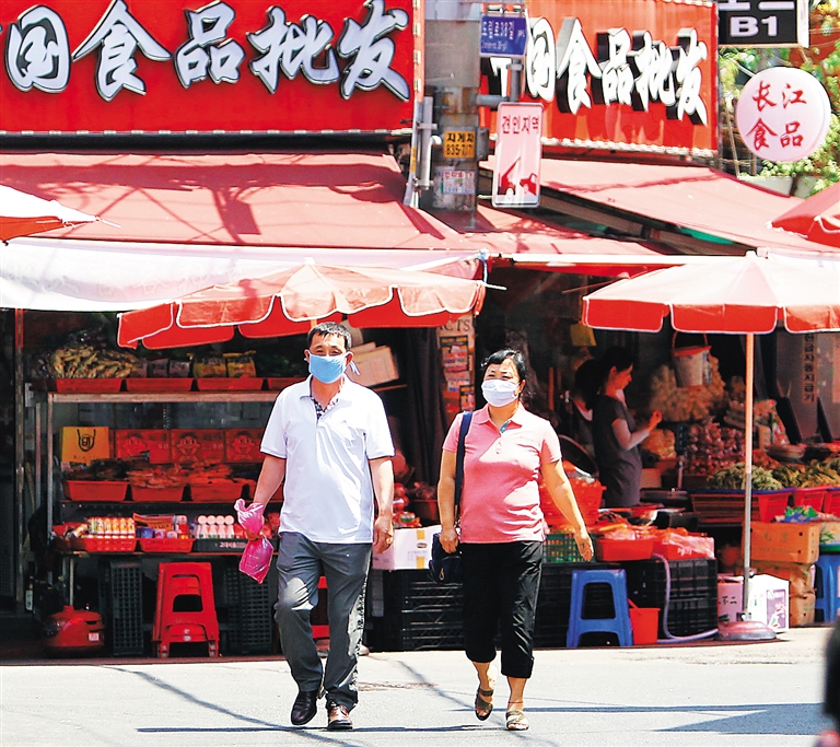 6月10日,两名行人经过韩国首尔中国人聚居地大林洞的一家店铺。 韩国卫生部门当日确认,一名中国公民在韩被确诊为中东呼吸综合征病例。患者金某在京畿道东滩圣心医院工作,接触的一名患者确诊MERS病例。金某于6月8日被确诊,现在韩定点医院隔离治疗。另据韩国保健福祉部10日通报,目前韩国MERS确诊患者上升至108人,死亡患者9人,共有3439人被隔离。
