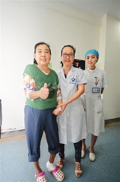 由于陈阿婆年事已高,且病史较长,各种并发症非常严重,符茂雄及其团队立即将老人送入糖尿病足诊疗工作室为其进行创面清创、辅料换药,同时控制血糖、血压、护肾、利尿消肿等治疗。1个月后,老人足跟创面感染得到控制和改善。医护人员接着又调整治疗方案,为老人行“自体富血小板凝胶”治疗,过程非常顺利。不久,老人足跟创面血供、肉芽生长均有改善,新鲜肉芽覆盖大部分肌腱,大洞基本愈合。