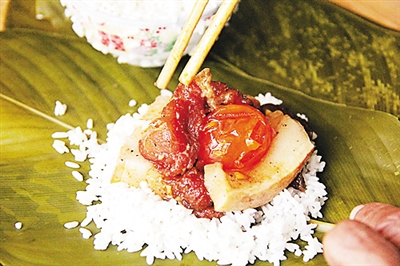 虽然叫做肉粽,但一枚黄亮晶莹的咸鸭蛋却不可少,可谓锦上还需添花。鸭蛋腌制太久则硬、咸,时间太短则蛋黄不能聚拢且味淡,恰到好处的咸蛋晶莹剔透,去除蛋清只留蛋黄。跟蔡阳打交道的腌蛋作坊不少,但他只选择光亮油润丰富的蛋黄,这也是他判断母鸭是否被喂食饲料的标准。可以说,定安粽子的选材,从每一片柊叶、一粒富硒糯米到蛋黄黑猪肉,样样都是绿色的原生态上好食材。