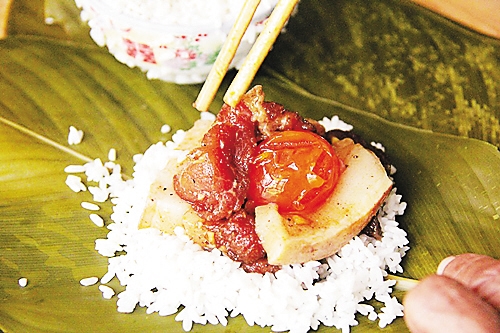 黑猪肉是海南肉粽的必备食材,但蔡阳对此更加挑剔。一定要来自获得国家地理标志认定的定安本地黑猪,不能饲料催生,吃杂粮长大的黑猪肉质更加鲜嫩浓香。猪肉要人工切出五花肉片后,经过数小时腌制,腌料中有蒜、酱油、香油,不同的调配比例呈现了不同的味道,这便是蔡阳从不外传的秘方。
