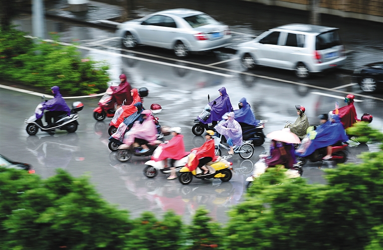 6月11日,广西南宁市民在暴雨中骑行。 当日,广西南宁、柳州、桂林、贵港、来宾、百色、河池等地先后发布暴雨预警信号。其中,柳州市、来宾市、宜州市、柳城县、乐业县、鹿寨县、西林县等市县先后发布暴雨红色预警信号,提醒有关部门和广大群众做好防暴雨应急和抢险工作。新华社记者 陆波岸 摄
