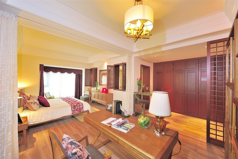设计理念:本方案在现代简洁的基础上结合地域特色,以柚木色为主色调,空间开阔大气,在用材上采用了本土特有的椰壳板、草编、贝壳板等特色材料,充分体现了设计结合地域文化的特色。