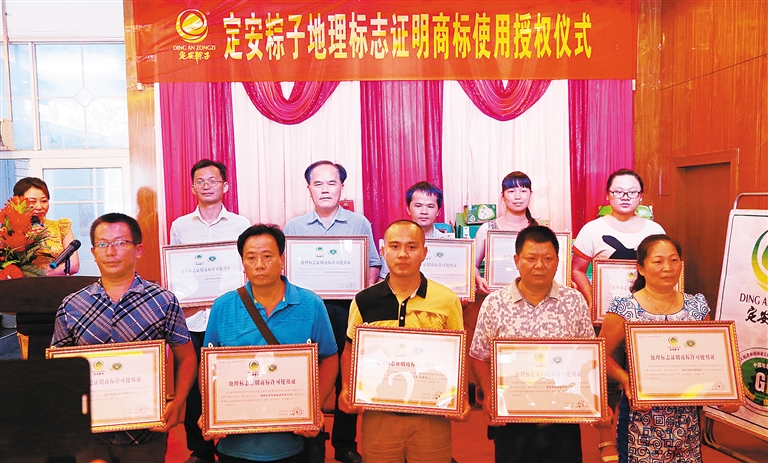 今年6月7日,“定安粽子”国家地理标志证明商标使用授权仪式在定安隆重举行。该县10家规模化粽子生产企业,获得定安粽子商标使用授权。从此每枚正宗定安粽子都有了受法律保护的“身份验证码”,消费者购买正宗定安粽子将更加放心。