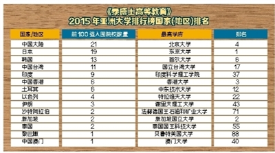 “这是一条大新闻!”巴蒂激动地告诉记者,尽管日本东京大学在亚太大学排行榜上占据第一位置,但在前100名的榜单上,中国大陆高校入围数量达到21所,以最大入围数量成为亚洲教育第一方阵,日本第二。