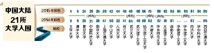 从这份排行榜看,中国大陆有3所新晋大学入围百强,入围大学数量从2014年的18所增加至今年的21所。北京大学名列第4,清华大学名列第5,均比2014年上升了一个名次。